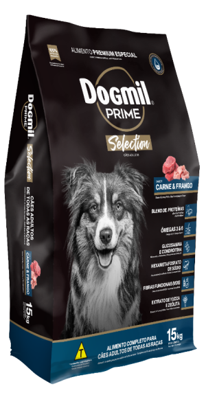 Dogmil Prime® é produzido com proteínas de origem animal e vegetal que oferecem aminoácidos e ácidos graxos das famílias ômega 3 e 6, essenciais para o transporte de vitaminas, fornecimento de energia e palatabilidade, sendo também enriquecido com vitaminas, minerais, condroitina e glucosamina, que promovem benefícios ao funcionamento do organismo, ossos e articulações dos cães.
